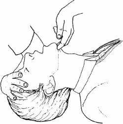 Κρατήστε τον αντίχειρα και το δείκτη του ίδιου χεριού ελεύθερα, για να κλείσετε τη μύτη εάν απαιτηθεί να του δώσετε αέρα με το στόμα σας (τεχνητή αναπνοή, «φιλί της ζωής»).
